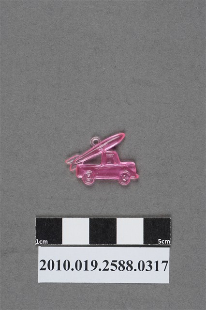 1.本件物為飛彈車造型尪仔仙,為粉紅色透明的塑膠材質。外型為一貨車,車斗上斜置一枚飛彈,彈身上方有一圓環。文物反面車斗與飛彈彈身各有一圓形痕。文物雙面均有磨痕。本系列尪仔仙多為相同塑膠模版,僅有顏色不同,或是同色同塑膠模版等形式。2.尪仔仙有小、中、大型之分,小型約長2公分,中型約長8-15公分左右,顏色以單色為主。長型則可長達30公分,以佛像、菩薩、神仙和唐三藏等造型為主,塗上金銀紅黃彩漆等亮色。1960、70年代的尪仔仙多以宗教、神話、布袋戲人物為造型。1980年代改以卡通、電玩、漫畫人物造型為主。常見玩法為兩人(或多人)各持一只尪仔仙,輪流用手指彈射,看誰的尪仔仙先疊在對方上面,便可贏得對方用來對戰的尪仔仙。