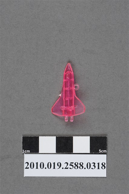 1.本件物為太空梭造型尪仔仙,為粉紅色透明的塑膠材質。外型為無火箭推進器的太空梭,機身切割出的六個圓柱體為軌道運行器,有磨損痕跡,機尾則是發動機。機翼設於中後方,機身左側有一圓環,右側有射出痕。機腹設有三個機輪,機首及機尾各有一圓形痕。本系列尪仔仙多為相同塑膠模版,僅有顏色不同,或是同色同塑膠模版等形式。2.尪仔仙有小、中、大型之分,小型約長2公分,中型約長8-15公分左右,顏色以單色為主。長型則可長達30公分,以佛像、菩薩、神仙和唐三藏等造型為主,塗上金銀紅黃彩漆等亮色。1960、70年代的尪仔仙多以宗教、神話、布袋戲人物為造型。1980年代改以卡通、電玩、漫畫人物造型為主。常見玩法為兩人(或多人)各持一只尪仔仙,輪流用手指彈射,看誰的尪仔仙先疊在對方上面,便可贏得對方用來對戰的尪仔仙。