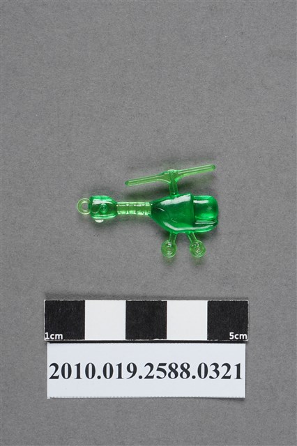 1.本物件為直升機造型尪仔仙,為綠色透明的塑膠材質。外型為直升機,主旋翼上方有射出痕痕跡。機身分為前方的駕駛艙及後方的機艙,駕駛艙為圓弧形。機尾有尾槳及一圓環,尾槳內有一圓球狀,下方有未修剪之殘膠。機身下方有兩個機輪。文物背面駕駛艙後方及尾槳處各有一圓形痕。本系列尪仔仙多為相同塑膠模版,僅有顏色不同,或是同色同塑膠模版等形式。2.尪仔仙有小、中、大型之分,小型約長2公分,中型約長8-15公分左右,顏色以單色為主。長型則可長達30公分,以佛像、菩薩、神仙和唐三藏等造型為主,塗上金銀紅黃彩漆等亮色。1960、70年代的尪仔仙多以宗教、神話、布袋戲人物為造型。1980年代改以卡通、電玩、漫畫人物造型為主。常見玩法為兩人(或多人)各持一只尪仔仙,輪流用手指彈射,看誰的尪仔仙先疊在對方上面,便可贏得對方用來對戰的尪仔仙。