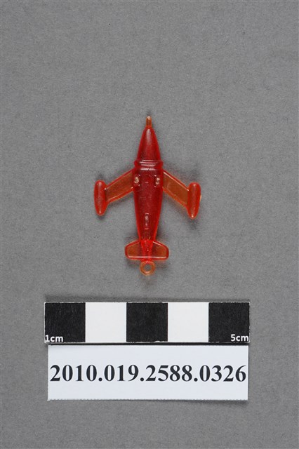 1.本物件為噴射機造型尪仔仙,為紅色透明的塑膠材質。外型為噴射機,左右兩側機翼尾端設有圓柱型噴射引擎,機首近機身處有一道斜痕,左側噴射引擎有射出痕。機尾有一圓環。機腹有三個突起物,應為機輪。機尾有一圓形痕,左側噴射引擎有些微磨痕。本系列尪仔仙多為相同塑膠模版,僅有顏色不同,或是同色同塑膠模版等形式。2.尪仔仙有小、中、大型之分,小型約長2公分,中型約長8-15公分左右,顏色以單色為主。長型則可長達30公分,以佛像、菩薩、神仙和唐三藏等造型為主,塗上金銀紅黃彩漆等亮色。1960、70年代的尪仔仙多以宗教、神話、布袋戲人物為造型。1980年代改以卡通、電玩、漫畫人物造型為主。常見玩法為兩人(或多人)各持一只尪仔仙,輪流用手指彈射,看誰的尪仔仙先疊在對方上面,便可贏得對方用來對戰的尪仔仙。