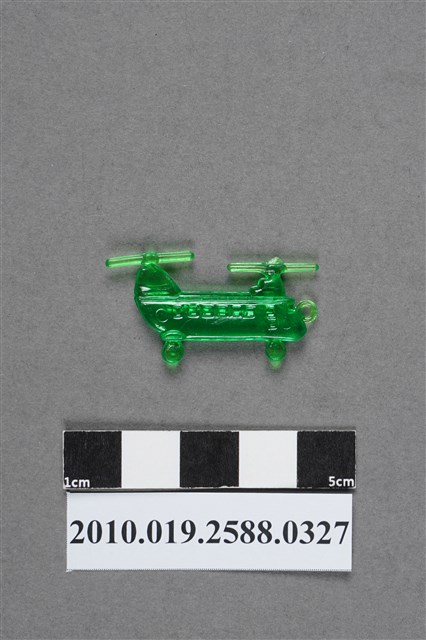 1.本物件為雙螺旋槳直升機造型尪仔仙,為綠色透明的塑膠材質。外型為雙螺旋槳直升機,前旋翼上有射出痕。機身上設有機艙門及窗戶,下方有兩個機輪。機鼻前有一圓環。文物反面機身尾端與近機鼻處各有一圓形痕跡,機身近窗處有磨痕。本系列尪仔仙多為相同塑膠模版,僅有顏色不同,或是同色同塑膠模版等形式。2.尪仔仙有小、中、大型之分,小型約長2公分,中型約長8-15公分左右,顏色以單色為主。長型則可長達30公分,以佛像、菩薩、神仙和唐三藏等造型為主,塗上金銀紅黃彩漆等亮色。1960、70年代的尪仔仙多以宗教、神話、布袋戲人物為造型。1980年代改以卡通、電玩、漫畫人物造型為主。常見玩法為兩人(或多人)各持一只尪仔仙,輪流用手指彈射,看誰的尪仔仙先疊在對方上面,便可贏得對方用來對戰的尪仔仙。