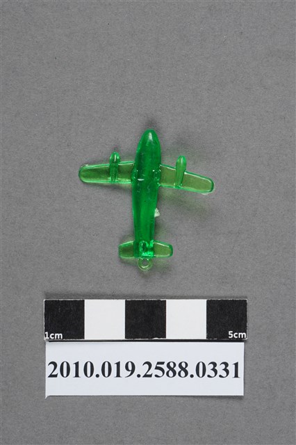 1.本物件為飛機造型尪仔仙,為綠色透明的塑膠材質。外型為飛機造型,機身為飛彈型,機身有些微向左彎曲,兩側機翼各有一發動機,機身左側有射出痕,設有尾翼及一圓環。機腹設有三個機輪,兩前輪中間與機尾各有一圓形痕。本系列尪仔仙多為相同塑膠模版,僅有顏色不同,或是同色同塑膠模版等形式。2.尪仔仙有小、中、大型之分,小型約長2公分,中型約長8-15公分左右,顏色以單色為主。長型則可長達30公分,以佛像、菩薩、神仙和唐三藏等造型為主,塗上金銀紅黃彩漆等亮色。1960、70年代的尪仔仙多以宗教、神話、布袋戲人物為造型。1980年代改以卡通、電玩、漫畫人物造型為主。常見玩法為兩人(或多人)各持一只尪仔仙,輪流用手指彈射,看誰的尪仔仙先疊在對方上面,便可贏得對方用來對戰的尪仔仙。