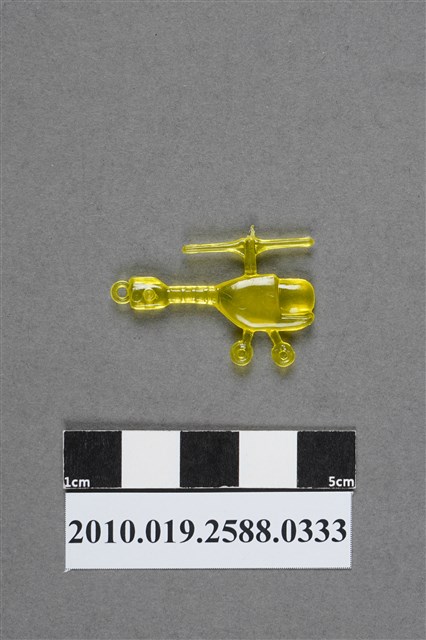 1.本物件為直升機造型尪仔仙,為黃色透明的塑膠材質。外型為直升機,主旋翼上方有射出痕。機身分為前方的駕駛艙及後方的機艙,駕駛艙為圓弧形。機尾有尾槳及一圓環,尾槳內有一圓球狀。機身下方有兩個機輪。文物背面駕駛艙後方及尾槳處各有一圓形痕。本系列尪仔仙多為相同塑膠模版,僅有顏色不同,或是同色同塑膠模版等形式。2.尪仔仙有小、中、大型之分,小型約長2公分,中型約長8-15公分左右,顏色以單色為主。長型則可長達30公分,以佛像、菩薩、神仙和唐三藏等造型為主,塗上金銀紅黃彩漆等亮色。1960、70年代的尪仔仙多以宗教、神話、布袋戲人物為造型。1980年代改以卡通、電玩、漫畫人物造型為主。常見玩法為兩人(或多人)各持一只尪仔仙,輪流用手指彈射,看誰的尪仔仙先疊在對方上面,便可贏得對方用來對戰的尪仔仙。