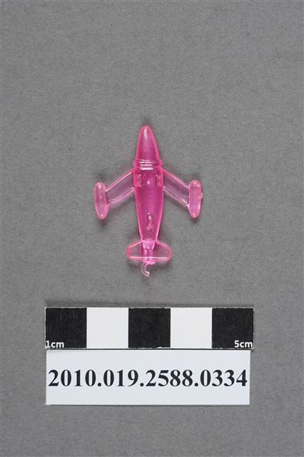 1.本物件為噴射機造型尪仔仙,為粉紅色透明的塑膠材質。外型為噴射機,機首尖端斷裂,左右兩側機翼尾端設有圓柱型噴射引擎,機首近機身處有一道斜痕,左側噴射引擎有射出痕,右側噴射引擎內有一氣泡,機尾的圓環斷裂僅存一半。機腹有三個突起物,應為機輪。機尾有一圓形痕,左側噴射引擎有些微磨痕。本系列尪仔仙多為相同塑膠模版,僅有顏色不同,或是同色同塑膠模版等形式。2.尪仔仙有小、中、大型之分,小型約長2公分,中型約長8-15公分左右,顏色以單色為主。長型則可長達30公分,以佛像、菩薩、神仙和唐三藏等造型為主,塗上金銀紅黃彩漆等亮色。1960、70年代的尪仔仙多以宗教、神話、布袋戲人物為造型。1980年代改以卡通、電玩、漫畫人物造型為主。常見玩法為兩人(或多人)各持一只尪仔仙,輪流用手指彈射,看誰的尪仔仙先疊在對方上面,便可贏得對方用來對戰的尪仔仙。