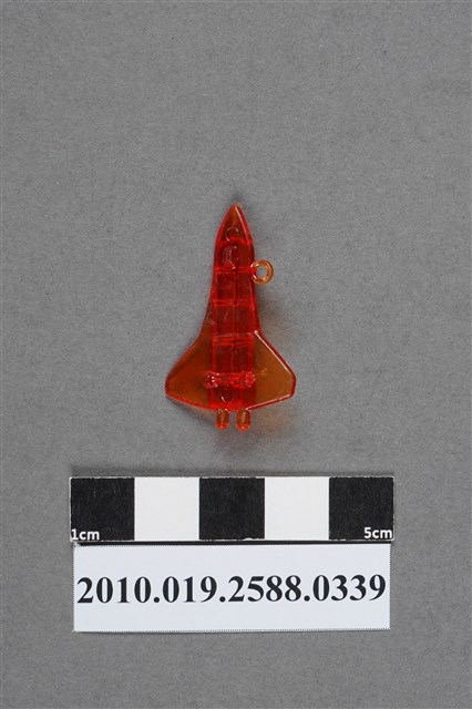 1.本物件為太空梭造型尪仔仙,為紅色透明的塑膠材質。外型為無火箭推進器的太空梭,機身切割出的六個圓柱體為軌道運行器,機尾則是發動機。機翼設於中後方,機身左側有一圓環,右側有射出痕痕跡。機腹設有三個機輪,機首及機尾各有一圓形痕。本系列尪仔仙多為相同塑膠模版,僅有顏色不同,或是同色同塑膠模版等形式。2.尪仔仙有小、中、大型之分,小型約長2公分,中型約長8-15公分左右,顏色以單色為主。長型則可長達30公分,以佛像、菩薩、神仙和唐三藏等造型為主,塗上金銀紅黃彩漆等亮色。1960、70年代的尪仔仙多以宗教、神話、布袋戲人物為造型。1980年代改以卡通、電玩、漫畫人物造型為主。常見玩法為兩人(或多人)各持一只尪仔仙,輪流用手指彈射,看誰的尪仔仙先疊在對方上面,便可贏得對方用來對戰的尪仔仙。