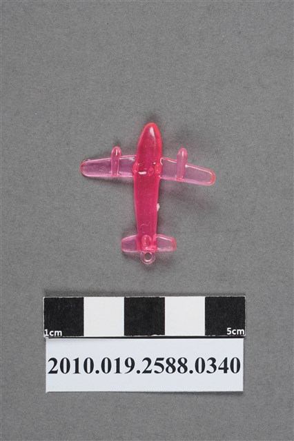 1.本物件為飛機造型尪仔仙,為粉紅色透明的塑膠材質。外型為飛機造型,機身為飛彈型,機身微向左彎曲,兩側機翼各有一發動機,機身近左側機翼處有一氣泡,機身左側有射出痕,設有尾翼及一圓環。機腹設有三個機輪,兩前輪中間與機尾各有一圓形痕。本系列尪仔仙多為相同塑膠模版,僅有顏色不同,或是同色同塑膠模版等形式。2.尪仔仙有小、中、大型之分,小型約長2公分,中型約長8-15公分左右,顏色以單色為主。長型則可長達30公分,以佛像、菩薩、神仙和唐三藏等造型為主,塗上金銀紅黃彩漆等亮色。1960、70年代的尪仔仙多以宗教、神話、布袋戲人物為造型。1980年代改以卡通、電玩、漫畫人物造型為主。常見玩法為兩人(或多人)各持一只尪仔仙,輪流用手指彈射,看誰的尪仔仙先疊在對方上面,便可贏得對方用來對戰的尪仔仙。