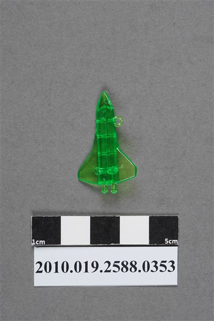 1.本物件為太空梭造型尪仔仙,為綠色透明的塑膠材質。外型為無火箭推進器的太空梭,機身切割出的六個圓柱體為軌道運行器,右側第二個運行器有一小黑點,機尾則是發動機。機翼設於中後方,機身左側有一圓環,右側有射出痕。機腹設有三個機輪,前機輪左後方有磨痕。機首及機尾各有一圓形痕。本系列尪仔仙多為相同塑膠模版,僅有顏色不同,或是同色同塑膠模版等形式。2.尪仔仙有小、中、大型之分,小型約長2公分,中型約長8-15公分左右,顏色以單色為主。長型則可長達30公分,以佛像、菩薩、神仙和唐三藏等造型為主,塗上金銀紅黃彩漆等亮色。1960、70年代的尪仔仙多以宗教、神話、布袋戲人物為造型。1980年代改以卡通、電玩、漫畫人物造型為主。常見玩法為兩人(或多人)各持一只尪仔仙,輪流用手指彈射,看誰的尪仔仙先疊在對方上面,便可贏得對方用來對戰的尪仔仙。