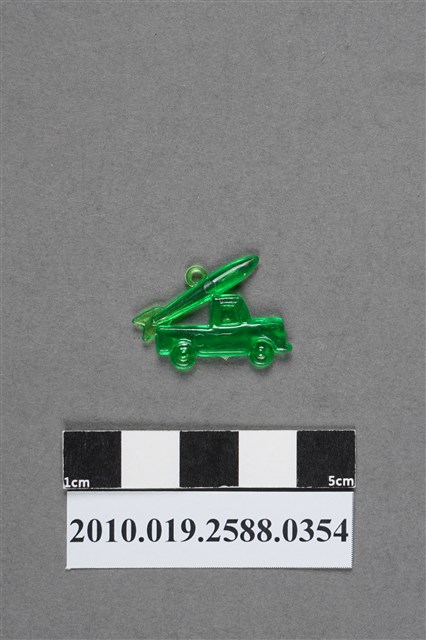 1.本物件為飛彈車造型尪仔仙,為綠色透明的塑膠材質。外型為一貨車,車斗上斜置一枚飛彈,彈身上方有一圓環,彈頭處有一長形氣泡,車底有射出痕。文物反面車斗與飛彈彈身各有一圓形痕。車身雙面均有磨痕。本系列尪仔仙多為相同塑膠模版,僅有顏色不同,或是同色同塑膠模版等形式。2.尪仔仙有小、中、大型之分,小型約長2公分,中型約長8-15公分左右,顏色以單色為主。長型則可長達30公分,以佛像、菩薩、神仙和唐三藏等造型為主,塗上金銀紅黃彩漆等亮色。1960、70年代的尪仔仙多以宗教、神話、布袋戲人物為造型。1980年代改以卡通、電玩、漫畫人物造型為主。常見玩法為兩人(或多人)各持一只尪仔仙,輪流用手指彈射,看誰的尪仔仙先疊在對方上面,便可贏得對方用來對戰的尪仔仙。