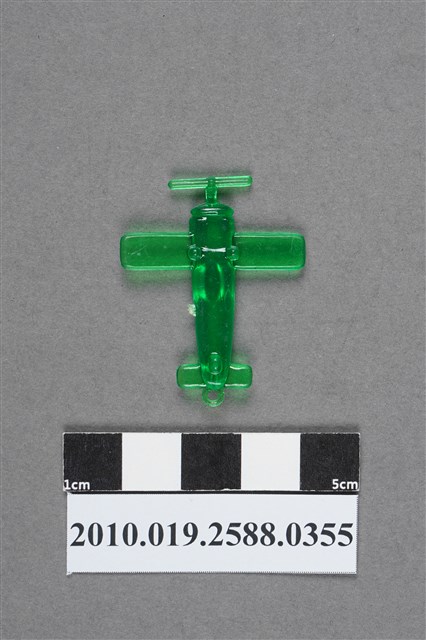 1.本物件為螺旋槳飛機造型尪仔仙,為綠色透明的塑膠材質。外型為螺旋槳飛機,機身可見一橢圓形機艙,機身右側有射出痕。機尾有一圓環,機腹於機翼及機尾各有一突起物,應為機輪。文物雙面均有磨痕。本系列尪仔仙多為相同塑膠模版,僅有顏色不同,或是同色同塑膠模版等形式。2.尪仔仙有小、中、大型之分,小型約長2公分,中型約長8-15公分左右,顏色以單色為主。長型則可長達30公分,以佛像、菩薩、神仙和唐三藏等造型為主,塗上金銀紅黃彩漆等亮色。1960、70年代的尪仔仙多以宗教、神話、布袋戲人物為造型。1980年代改以卡通、電玩、漫畫人物造型為主。常見玩法為兩人(或多人)各持一只尪仔仙,輪流用手指彈射,看誰的尪仔仙先疊在對方上面,便可贏得對方用來對戰的尪仔仙。