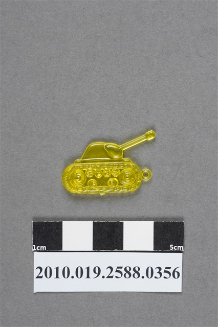 1.本物件為戰車造型尪仔仙,為黃色透明的塑膠材質。外型為戰車,炮塔左側為炮管。下方為履帶,履帶內有動輪與路輪。履帶左側有一圓環,下方有射出痕。文物反面炮管尖端有一黑點。本系列尪仔仙多為相同塑膠模版,僅有顏色不同,或是同色同塑膠模版等形式。2.尪仔仙有小、中、大型之分,小型約長2公分,中型約長8-15公分左右,顏色以單色為主。長型則可長達30公分,以佛像、菩薩、神仙和唐三藏等造型為主,塗上金銀紅黃彩漆等亮色。1960、70年代的尪仔仙多以宗教、神話、布袋戲人物為造型。1980年代改以卡通、電玩、漫畫人物造型為主。常見玩法為兩人(或多人)各持一只尪仔仙,輪流用手指彈射,看誰的尪仔仙先疊在對方上面,便可贏得對方用來對戰的尪仔仙。