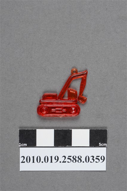 1.本物件為挖土機造型尪仔仙,為紅色透明的塑膠材質。外型為挖土機,機體有最下方的屨帶、中間的旋轉平台、駕駛座,及機械手臂和挖斗,機械前臂及機械手臂後面的引擎各有一圓形痕,後臂上有一圓環。履帶下方有射出痕。本系列尪仔仙多為相同塑膠模版,僅有顏色不同,或是同色同塑膠模版等形式。2.尪仔仙有小、中、大型之分,小型約長2公分,中型約長8-15公分左右,顏色以單色為主。長型則可長達30公分,以佛像、菩薩、神仙和唐三藏等造型為主,塗上金銀紅黃彩漆等亮色。1960、70年代的尪仔仙多以宗教、神話、布袋戲人物為造型。1980年代改以卡通、電玩、漫畫人物造型為主。常見玩法為兩人(或多人)各持一只尪仔仙,輪流用手指彈射,看誰的尪仔仙先疊在對方上面,便可贏得對方用來對戰的尪仔仙。