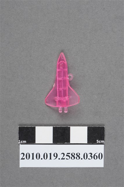 1.本物件為太空梭造型尪仔仙,為粉紅色透明的塑膠材質。外型為無火箭推進器的太空梭,機身切割出的六個圓柱體為軌道運行器,機尾則是發動機。機翼設於中後方,機身左側有一圓環,右側有射出痕。機腹設有三個機輪,機首及機尾各有一圓形痕。文物雙面均有磨痕,正面磨痕較為明顯。本系列尪仔仙多為相同塑膠模版,僅有顏色不同,或是同色同塑膠模版等形式。2.尪仔仙有小、中、大型之分,小型約長2公分,中型約長8-15公分左右,顏色以單色為主。長型則可長達30公分,以佛像、菩薩、神仙和唐三藏等造型為主,塗上金銀紅黃彩漆等亮色。1960、70年代的尪仔仙多以宗教、神話、布袋戲人物為造型。1980年代改以卡通、電玩、漫畫人物造型為主。常見玩法為兩人(或多人)各持一只尪仔仙,輪流用手指彈射,看誰的尪仔仙先疊在對方上面,便可贏得對方用來對戰的尪仔仙。
