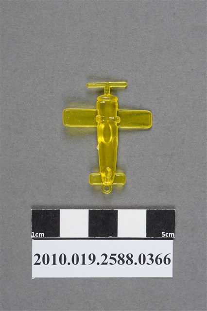 1.本物件為螺旋槳飛機造型尪仔仙,為黃色透明的塑膠材質。外型為螺旋槳飛機,機身可見一橢圓形機艙,還有數個小黑點,機身右側有射出痕。機尾有一圓環,機腹於機翼及機尾各有一突起物,應為機輪。本系列尪仔仙多為相同塑膠模版,僅有顏色不同,或是同色同塑膠模版等形式。2.尪仔仙有小、中、大型之分,小型約長2公分,中型約長8-15公分左右,顏色以單色為主。長型則可長達30公分,以佛像、菩薩、神仙和唐三藏等造型為主,塗上金銀紅黃彩漆等亮色。1960、70年代的尪仔仙多以宗教、神話、布袋戲人物為造型。1980年代改以卡通、電玩、漫畫人物造型為主。常見玩法為兩人(或多人)各持一只尪仔仙,輪流用手指彈射,看誰的尪仔仙先疊在對方上面,便可贏得對方用來對戰的尪仔仙。
