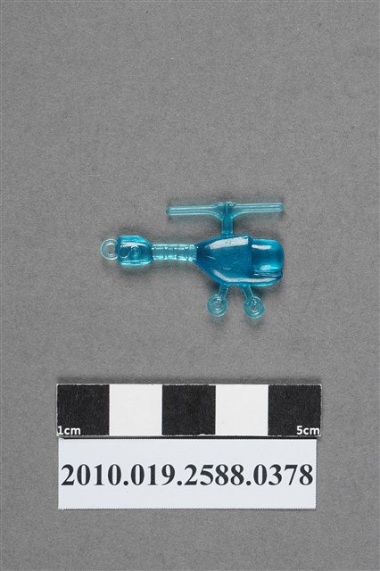 1.本物件為直升機造型尪仔仙,為藍色透明的塑膠材質。外型為直升機,主旋翼上有射出痕。機身分為前方的駕駛艙及後方的機艙,駕駛艙為圓弧形。機尾有尾槳及一圓環,尾槳內有一圓球狀。機身下方有兩個機輪。文物背面駕駛艙後方及尾槳處各有一圓形痕。文物雙面均有些微磨痕。本系列尪仔仙多為相同塑膠模版,僅有顏色不同,或是同色同塑膠模版等形式。2.尪仔仙有小、中、大型之分,小型約長2公分,中型約長8-15公分左右,顏色以單色為主。長型則可長達30公分,以佛像、菩薩、神仙和唐三藏等造型為主,塗上金銀紅黃彩漆等亮色。1960、70年代的尪仔仙多以宗教、神話、布袋戲人物為造型。1980年代改以卡通、電玩、漫畫人物造型為主。常見玩法為兩人(或多人)各持一只尪仔仙,輪流用手指彈射,看誰的尪仔仙先疊在對方上面,便可贏得對方用來對戰的尪仔仙。