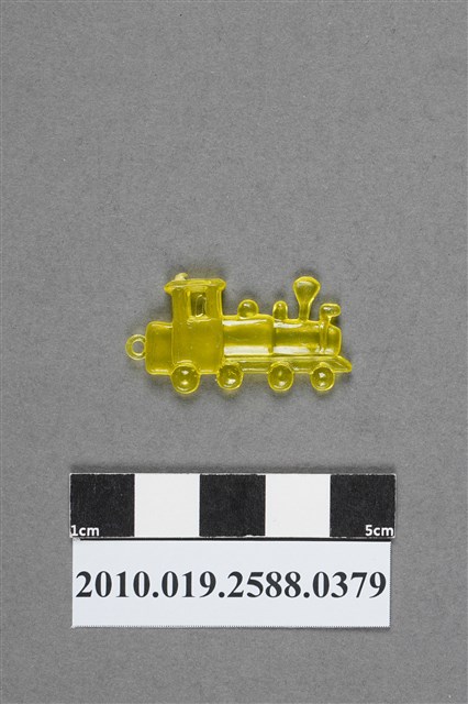 1.本物件為蒸機造型尪仔仙,為黃色透明的塑膠材質。外型為蒸氣火車頭,樣式似為臺鐵80號型蒸氣火車,車頭為車前燈、煙囪、儲氣室等構造。車體下方僅做出動輪,並無做出連結桿等細部結構。駕駛座上有射出痕,車窗有一似破洞痕,車尾有一圓環。文物背面煙囪下方有一圓形痕。本系列尪仔仙多為相同塑膠模版,僅有顏色不同,或是同色同塑膠模版等形式。2.尪仔仙有小、中、大型之分,小型約長2公分,中型約長8-15公分左右,顏色以單色為主。長型則可長達30公分,以佛像、菩薩、神仙和唐三藏等造型為主,塗上金銀紅黃彩漆等亮色。1960、70年代的尪仔仙多以宗教、神話、布袋戲人物為造型。1980年代改以卡通、電玩、漫畫人物造型為主。常見玩法為兩人(或多人)各持一只尪仔仙,輪流用手指彈射,看誰的尪仔仙先疊在對方上面,便可贏得對方用來對戰的尪仔仙。