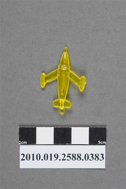 1.本物件為噴射機造型尪仔仙,為黃色透明的塑膠材質。外型為噴射機,左右兩側機翼尾端設有圓柱型噴射引擎,機首近機身處有一道斜痕,左側噴射引擎有射出痕,兩側機翼內均內含小氣泡。機尾有一圓環。機腹有三個突起物,為機輪。機尾與兩前輪間各有一圓形痕。本系列尪仔仙多為相同塑膠模版,僅有顏色不同,或是同色同塑膠模版等形式。2.尪仔仙有小、中、大型之分,小型約長2公分,中型約長8-15公分左右,顏色以單色為主。長型則可長達30公分,以佛像、菩薩、神仙和唐三藏等造型為主,塗上金銀紅黃彩漆等亮色。1960、70年代的尪仔仙多以宗教、神話、布袋戲人物為造型。1980年代改以卡通、電玩、漫畫人物造型為主。常見玩法為兩人(或多人)各持一只尪仔仙,輪流用手指彈射,看誰的尪仔仙先疊在對方上面,便可贏得對方用來對戰的尪仔仙。