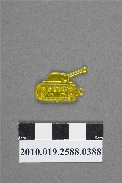 1.本物件為戰車造型尪仔仙,為黃色透明的塑膠材質。外型為戰車,炮塔左側為炮管,炮管末端有小氣泡。下方為履帶,履帶內有動輪與路輪。履帶左側有一圓環,下方有射出痕痕跡。本系列尪仔仙多為相同塑膠模版,僅有顏色不同,或是同色同塑膠模版等形式。2.尪仔仙有小、中、大型之分,小型約長2公分,中型約長8-15公分左右,顏色以單色為主。長型則可長達30公分,以佛像、菩薩、神仙和唐三藏等造型為主,塗上金銀紅黃彩漆等亮色。1960、70年代的尪仔仙多以宗教、神話、布袋戲人物為造型。1980年代改以卡通、電玩、漫畫人物造型為主。常見玩法為兩人(或多人)各持一只尪仔仙,輪流用手指彈射,看誰的尪仔仙先疊在對方上面,便可贏得對方用來對戰的尪仔仙。