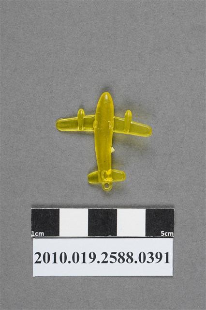 1.本物件為飛機造型尪仔仙,為黃色透明的塑膠材質。外型為飛機造型,機身為飛彈型,尾端微向左彎曲,兩側機翼各有一發動機,右側機翼末端有殘膠。機身左側有射出痕,設有尾翼及一圓環。機身近機尾內部有一道痕、微小氣泡及黑點。機腹設有三個機輪,兩前輪中間與機尾各有一圓形痕,有些微磨損痕跡。本系列尪仔仙多為相同塑膠模版,僅有顏色不同,或是同色同塑膠模版等形式。2.尪仔仙有小、中、大型之分,小型約長2公分,中型約長8-15公分左右,顏色以單色為主。長型則可長達30公分,以佛像、菩薩、神仙和唐三藏等造型為主,塗上金銀紅黃彩漆等亮色。1960、70年代的尪仔仙多以宗教、神話、布袋戲人物為造型。1980年代改以卡通、電玩、漫畫人物造型為主。常見玩法為兩人(或多人)各持一只尪仔仙,輪流用手指彈射,看誰的尪仔仙先疊在對方上面,便可贏得對方用來對戰的尪仔仙。