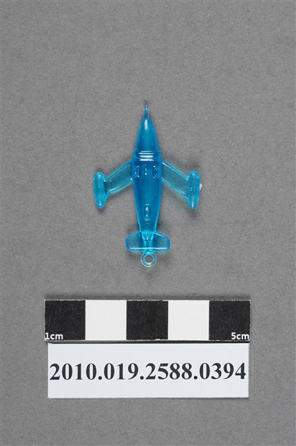 1.本物件為噴射機造型尪仔仙,為藍色透明的塑膠材質。外型為噴射機,左右兩側機翼尾端設有圓柱型噴射引擎,機首近機身處有一道斜痕,兩側噴射引擎內均有一小氣泡,左側噴射引擎有射出痕。機尾有一圓環。機腹有三個突起物,為機輪。機尾與兩前輪間各有一圓形痕。本系列尪仔仙多為相同塑膠模版,僅有顏色不同,或是同色同塑膠模版等形式。2.尪仔仙有小、中、大型之分,小型約長2公分,中型約長8-15公分左右,顏色以單色為主。長型則可長達30公分,以佛像、菩薩、神仙和唐三藏等造型為主,塗上金銀紅黃彩漆等亮色。1960、70年代的尪仔仙多以宗教、神話、布袋戲人物為造型。1980年代改以卡通、電玩、漫畫人物造型為主。常見玩法為兩人(或多人)各持一只尪仔仙,輪流用手指彈射,看誰的尪仔仙先疊在對方上面,便可贏得對方用來對戰的尪仔仙。