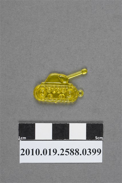1.本物件為戰車造型尪仔仙,為黃色透明的塑膠材質。外型為戰車,炮塔左側為炮管,炮管末端有小氣泡,炮塔有輕微磨痕。下方為履帶,履帶內有動輪與路輪。履帶左側有一圓環,下方有射出痕。本系列尪仔仙多為相同塑膠模版,僅有顏色不同,或是同色同塑膠模版等形式。2.尪仔仙有小、中、大型之分,小型約長2公分,中型約長8-15公分左右,顏色以單色為主。長型則可長達30公分,以佛像、菩薩、神仙和唐三藏等造型為主,塗上金銀紅黃彩漆等亮色。1960、70年代的尪仔仙多以宗教、神話、布袋戲人物為造型。1980年代改以卡通、電玩、漫畫人物造型為主。常見玩法為兩人(或多人)各持一只尪仔仙,輪流用手指彈射,看誰的尪仔仙先疊在對方上面,便可贏得對方用來對戰的尪仔仙。