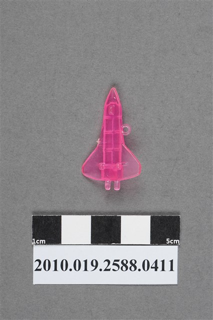 1.本物件為太空梭造型尪仔仙,為粉紅色透明的塑膠材質。外型為無火箭推進器的太空梭,機身切割出的六個圓柱體為軌道運行器,機尾則是發動機。機翼設於中後方,機身左側有一圓環,右側有射出痕。機腹設有三個機輪,機首及機尾各有一圓形痕。物件雙面均有磨痕。本系列尪仔仙多為相同塑膠模版,僅有顏色不同,或是同色同塑膠模版等形式。2.尪仔仙有小、中、大型之分,小型約長2公分,中型約長8-15公分左右,顏色以單色為主。長型則可長達30公分,以佛像、菩薩、神仙和唐三藏等造型為主,塗上金銀紅黃彩漆等亮色。1960、70年代的尪仔仙多以宗教、神話、布袋戲人物為造型。1980年代改以卡通、電玩、漫畫人物造型為主。常見玩法為兩人(或多人)各持一只尪仔仙,輪流用手指彈射,看誰的尪仔仙先疊在對方上面,便可贏得對方用來對戰的尪仔仙。