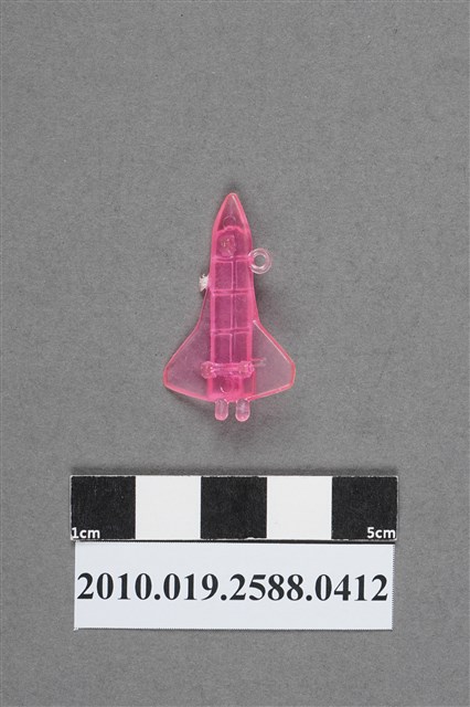 1.本物件為太空梭造型尪仔仙,為粉紅色透明的塑膠材質。外型為無火箭推進器的太空梭,機身切割出的六個圓柱體為軌道運行器,機尾則是發動機。機翼設於中後方,機身左側有一圓環,右側有射出痕。機腹設有三個機輪,機首及機尾各有一圓形痕。物件雙面均有細碎磨痕。本系列尪仔仙多為相同塑膠模版,僅有顏色不同,或是同色同塑膠模版等形式。2.尪仔仙有小、中、大型之分,小型約長2公分,中型約長8-15公分左右,顏色以單色為主。長型則可長達30公分,以佛像、菩薩、神仙和唐三藏等造型為主,塗上金銀紅黃彩漆等亮色。1960、70年代的尪仔仙多以宗教、神話、布袋戲人物為造型。1980年代改以卡通、電玩、漫畫人物造型為主。常見玩法為兩人(或多人)各持一只尪仔仙,輪流用手指彈射,看誰的尪仔仙先疊在對方上面,便可贏得對方用來對戰的尪仔仙。