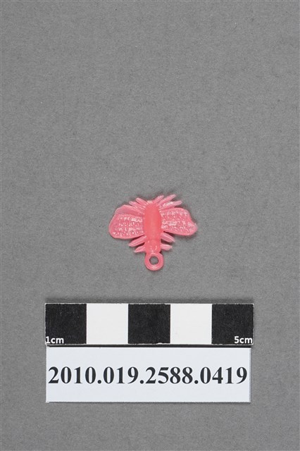 1.本物件為飛蛾造型尪仔仙,為粉紅色塑膠材質。外型為一類似蛾類昆蟲,翅膀以兩層做出兩對的樣子,上有凹凸痕,頂端有射出痕,射出痕兩旁應為觸角及兩對腳,尾端有兩對腳及一圓環。本物件樣式並不符合昆蟲外形特徵,只做出類似的形體。本系列尪仔仙多為相同塑膠模版,僅有顏色不同,或是同色同塑膠模版等形式。2.尪仔仙有小、中、大型之分,小型約長2公分,中型約長8-15公分左右,顏色以單色為主。長型則可長達30公分,以佛像、菩薩、神仙和唐三藏等造型為主,塗上金銀紅黃彩漆等亮色。1960、70年代的尪仔仙多以宗教、神話、布袋戲人物為造型。1980年代改以卡通、電玩、漫畫人物造型為主。常見玩法為兩人(或多人)各持一只尪仔仙,輪流用手指彈射,看誰的尪仔仙先疊在對方上面,便可贏得對方用來對戰的尪仔仙。