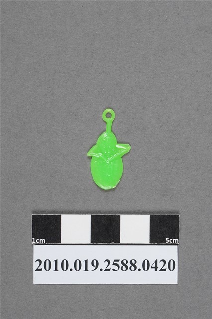 1.本物件為石榴造型尪仔仙,為綠色塑膠材質。外型為石榴,左右兩側做出剝離本體一半的外殼,中間的主體做出顆粒感覺。頂端有一圓環。本系列尪仔仙多為相同塑膠模版,僅有顏色不同,或是同色同塑膠模版等形式。2.尪仔仙有小、中、大型之分,小型約長2公分,中型約長8-15公分左右,顏色以單色為主。長型則可長達30公分,以佛像、菩薩、神仙和唐三藏等造型為主,塗上金銀紅黃彩漆等亮色。1960、70年代的尪仔仙多以宗教、神話、布袋戲人物為造型。1980年代改以卡通、電玩、漫畫人物造型為主。常見玩法為兩人(或多人)各持一只尪仔仙,輪流用手指彈射,看誰的尪仔仙先疊在對方上面,便可贏得對方用來對戰的尪仔仙。