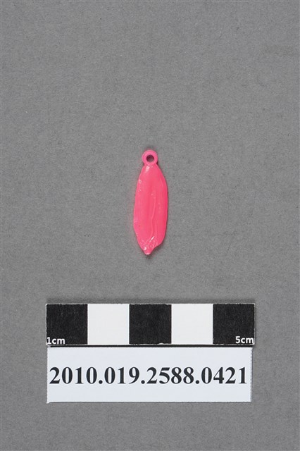 1.本物件為玉米造型尪仔仙,為粉紅色塑膠材質。外型為玉米,尾端做出玉米尖端數層外皮層層包覆的感覺。背面有數道痕跡,顯示為被外皮完整包覆的玉米。頂端有一圓環。本系列尪仔仙多為相同塑膠模版,僅有顏色不同,或是同色同塑膠模版等形式。2.尪仔仙有小、中、大型之分,小型約長2公分,中型約長8-15公分左右,顏色以單色為主。長型則可長達30公分,以佛像、菩薩、神仙和唐三藏等造型為主,塗上金銀紅黃彩漆等亮色。1960、70年代的尪仔仙多以宗教、神話、布袋戲人物為造型。1980年代改以卡通、電玩、漫畫人物造型為主。常見玩法為兩人(或多人)各持一只尪仔仙,輪流用手指彈射,看誰的尪仔仙先疊在對方上面,便可贏得對方用來對戰的尪仔仙。