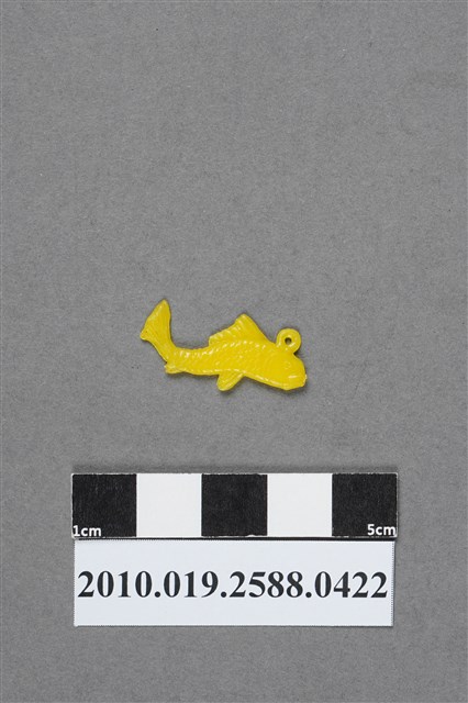 1.本物件為鯉魚造型尪仔仙,為黃色塑膠材質。外型為鯉魚,魚鱗與各部位魚鰭均如實呈現,魚頭上方有一圓環,魚嘴處有射出痕痕跡。物件雙面樣貌不同,為左右不同角度的視角呈現。本系列尪仔仙多為相同塑膠模版,僅有顏色不同,或是同色同塑膠模版等形式。2.尪仔仙有小、中、大型之分,小型約長2公分,中型約長8-15公分左右,顏色以單色為主。長型則可長達30公分,以佛像、菩薩、神仙和唐三藏等造型為主,塗上金銀紅黃彩漆等亮色。1960、70年代的尪仔仙多以宗教、神話、布袋戲人物為造型。1980年代改以卡通、電玩、漫畫人物造型為主。常見玩法為兩人(或多人)各持一只尪仔仙,輪流用手指彈射,看誰的尪仔仙先疊在對方上面,便可贏得對方用來對戰的尪仔仙。