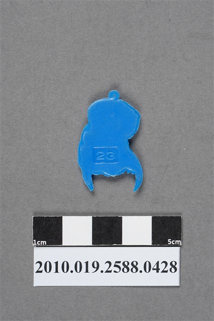 1.本物件為昆蟲頭部造型尪仔仙,為藍色塑膠材質。外型為昆蟲頭部,頭頂有圓環,吻部有一對大顎,顎上方有一對觸鬚,兩眼中間有一似角狀物。物件背面平滑,下方有一方框,內有數字「23」字樣。本系列尪仔仙多為相同塑膠模版,僅有顏色不同,或是同色同塑膠模版等形式。2.尪仔仙有小、中、大型之分,小型約長2公分,中型約長8-15公分左右,顏色以單色為主。長型則可長達30公分,以佛像、菩薩、神仙和唐三藏等造型為主,塗上金銀紅黃彩漆等亮色。1960、70年代的尪仔仙多以宗教、神話、布袋戲人物為造型。1980年代改以卡通、電玩、漫畫人物造型為主。常見玩法為兩人(或多人)各持一只尪仔仙,輪流用手指彈射,看誰的尪仔仙先疊在對方上面,便可贏得對方用來對戰的尪仔仙。