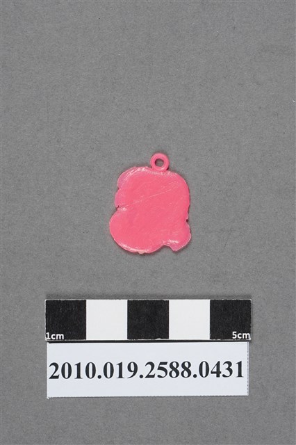 1.本物件為孫悟空頭像造型尪仔仙,為粉紅色塑膠材質。外型為孫悟空頭像,頭戴金箍,頭頂有一圓環。臉頰旁有鬢毛,下頷處有射出痕。物件背面有磨損痕跡。本系列尪仔仙多為相同塑膠模版,僅有顏色不同,或是同色同塑膠模版等形式。2.尪仔仙有小、中、大型之分,小型約長2公分,中型約長8-15公分左右,顏色以單色為主。長型則可長達30公分,以佛像、菩薩、神仙和唐三藏等造型為主,塗上金銀紅黃彩漆等亮色。1960、70年代的尪仔仙多以宗教、神話、布袋戲人物為造型。1980年代改以卡通、電玩、漫畫人物造型為主。常見玩法為兩人(或多人)各持一只尪仔仙,輪流用手指彈射,看誰的尪仔仙先疊在對方上面,便可贏得對方用來對戰的尪仔仙。3.孫悟空為吳承恩著《西遊記》中人物,為唐三藏的徒弟之一,前身為石猴。