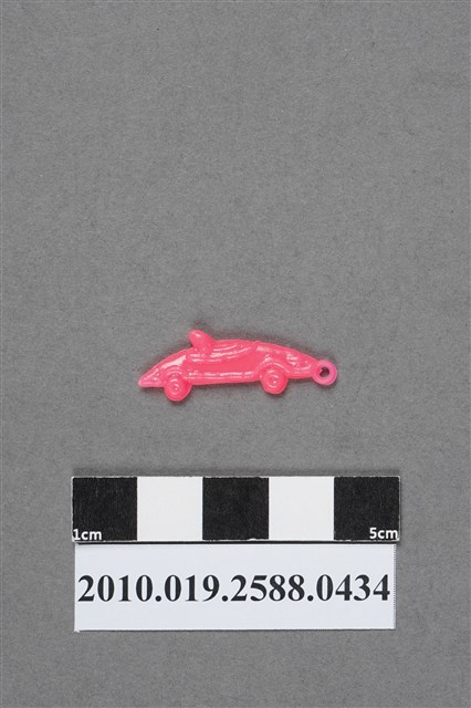1.本物件為敞篷跑車造型尪仔仙,為粉紅色塑膠材質。外型為敞篷跑車,車身呈梭狀,車上僅有一人座位,隱約可見一手置方向盤的人形,車頭有一圓環。本系列尪仔仙多為相同塑膠模版,僅有顏色不同,或是同色同塑膠模版等形式。2.尪仔仙有小、中、大型之分,小型約長2公分,中型約長8-15公分左右,顏色以單色為主。長型則可長達30公分,以佛像、菩薩、神仙和唐三藏等造型為主,塗上金銀紅黃彩漆等亮色。1960、70年代的尪仔仙多以宗教、神話、布袋戲人物為造型。1980年代改以卡通、電玩、漫畫人物造型為主。常見玩法為兩人(或多人)各持一只尪仔仙,輪流用手指彈射,看誰的尪仔仙先疊在對方上面,便可贏得對方用來對戰的尪仔仙。