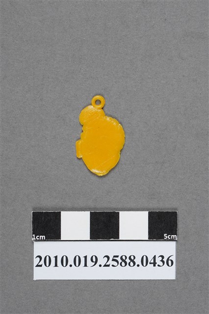 1.本物件為女性頭像造型尪仔仙,為黃色塑膠材質。外型為一女性頭像,額上繫有眉勒,眉勒中有一方形飾品。頭上有一圓髻,髻上有一圓環。面部表情平和,應為中年婦女,下頷處有射出痕。物件背面有許多刮痕。本系列尪仔仙多為相同塑膠模版,僅有顏色不同,或是同色同塑膠模版等形式。2.尪仔仙有小、中、大型之分,小型約長2公分,中型約長8-15公分左右,顏色以單色為主。長型則可長達30公分,以佛像、菩薩、神仙和唐三藏等造型為主,塗上金銀紅黃彩漆等亮色。1960、70年代的尪仔仙多以宗教、神話、布袋戲人物為造型。1980年代改以卡通、電玩、漫畫人物造型為主。常見玩法為兩人(或多人)各持一只尪仔仙,輪流用手指彈射,看誰的尪仔仙先疊在對方上面,便可贏得對方用來對戰的尪仔仙。