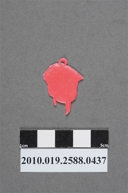 1.本物件為男性頭像造型尪仔仙,為粉紅色塑膠材質。外型為一男性頭像,頭帶儒巾,儒巾上方有一圓環。男子表情嚴肅,蓄有鬢髮及山羊鬍。物件雙面均有磨損痕跡。本系列尪仔仙多為相同塑膠模版,僅有顏色不同,或是同色同塑膠模版等形式。2.尪仔仙有小、中、大型之分,小型約長2公分,中型約長8-15公分左右,顏色以單色為主。長型則可長達30公分,以佛像、菩薩、神仙和唐三藏等造型為主,塗上金銀紅黃彩漆等亮色。1960、70年代的尪仔仙多以宗教、神話、布袋戲人物為造型。1980年代改以卡通、電玩、漫畫人物造型為主。常見玩法為兩人(或多人)各持一只尪仔仙,輪流用手指彈射,看誰的尪仔仙先疊在對方上面,便可贏得對方用來對戰的尪仔仙。