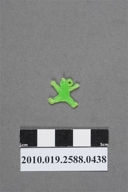 1.本物件為幼童造型尪仔仙,為綠色塑膠材質。外型為一幼童,雙手高舉,兩腳分開呈坐姿,臉部模糊無法辨識,頭左側有一圓環,頭頂有射出痕。軀幹中間有三顆凸起,應為鈕釦。物件反面頭部有斜痕,應為頭髮。本系列尪仔仙多為相同塑膠模版,僅有顏色不同,或是同色同塑膠模版等形式。2.尪仔仙有小、中、大型之分,小型約長2公分,中型約長8-15公分左右,顏色以單色為主。長型則可長達30公分,以佛像、菩薩、神仙和唐三藏等造型為主,塗上金銀紅黃彩漆等亮色。1960、70年代的尪仔仙多以宗教、神話、布袋戲人物為造型。1980年代改以卡通、電玩、漫畫人物造型為主。常見玩法為兩人(或多人)各持一只尪仔仙,輪流用手指彈射,看誰的尪仔仙先疊在對方上面,便可贏得對方用來對戰的尪仔仙。
