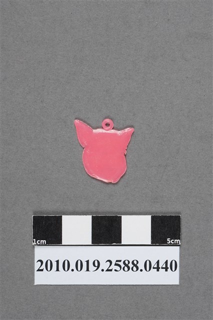 1.本物件為豬八戒頭像造型尪仔仙,為粉紅色塑膠材質。外型為豬八戒,面部為豬頭,眼睛炯炯有神,面露笑容,左眼有殘膠,下頷有一凹痕,頭頂有一圓環。物件雙面均有些微磨損痕跡。本系列尪仔仙多為相同塑膠模版,僅有顏色不同,或是同色同塑膠模版等形式。2.尪仔仙有小、中、大型之分,小型約長2公分,中型約長8-15公分左右,顏色以單色為主。長型則可長達30公分,以佛像、菩薩、神仙和唐三藏等造型為主,塗上金銀紅黃彩漆等亮色。1960、70年代的尪仔仙多以宗教、神話、布袋戲人物為造型。1980年代改以卡通、電玩、漫畫人物造型為主。常見玩法為兩人(或多人)各持一只尪仔仙,輪流用手指彈射,看誰的尪仔仙先疊在對方上面,便可贏得對方用來對戰的尪仔仙。3.豬八戒為吳承恩著《西遊記》中人物,為唐三藏的徒弟之一,原為天篷元帥,因犯天條被貶而成豬妖。