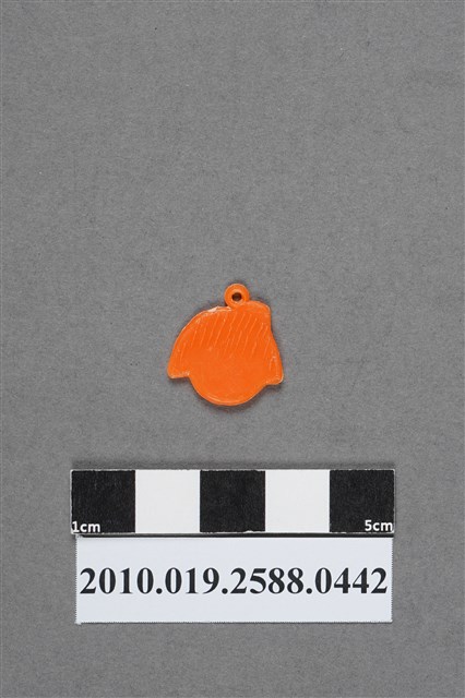 1.本物件為女性頭像造型尪仔仙,為橘色塑膠材質。外型為一短髮女性,五官呈現方式簡單,以凹凸痕呈現頭髮,頭頂偏左有一圓形裝飾品,旁為一圓環。頭頂偏右有射出痕痕跡。物件背面以數道直痕呈現髮絲。本系列尪仔仙多為相同塑膠模版,僅有顏色不同,或是同色同塑膠模版等形式。2.尪仔仙有小、中、大型之分,小型約長2公分,中型約長8-15公分左右,顏色以單色為主。長型則可長達30公分,以佛像、菩薩、神仙和唐三藏等造型為主,塗上金銀紅黃彩漆等亮色。1960、70年代的尪仔仙多以宗教、神話、布袋戲人物為造型。1980年代改以卡通、電玩、漫畫人物造型為主。常見玩法為兩人(或多人)各持一只尪仔仙,輪流用手指彈射,看誰的尪仔仙先疊在對方上面,便可贏得對方用來對戰的尪仔仙。