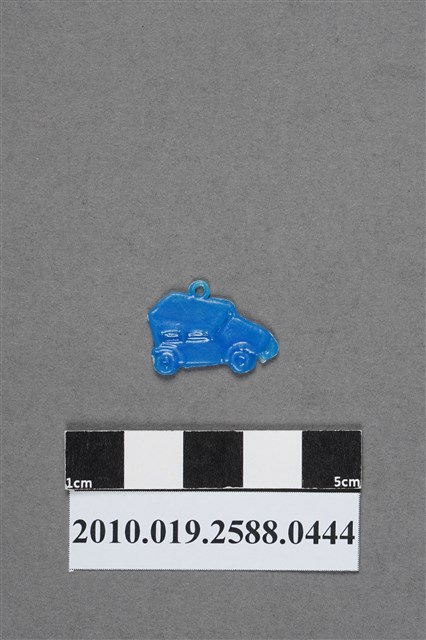 1.本物件為車造型尪仔仙,為藍色塑膠材質。外型為車,車形方正,車頂上方有圓形環,後方有射出痕。引擎蓋飾有橫紋至盡頭為半圓形保險桿。車身有兩面車窗,並無做出車門形狀,後輪後側有白色磨損痕跡。物件背面可看出正面大致造型,但無細部結構。本系列尪仔仙多為相同塑膠模版,僅有顏色不同,或是同色同塑膠模版等形式。2.尪仔仙有小、中、大型之分,小型約長2公分,中型約長8-15公分左右,顏色以單色為主。長型則可長達30公分,以佛像、菩薩、神仙和唐三藏等造型為主,塗上金銀紅黃彩漆等亮色。1960、70年代的尪仔仙多以宗教、神話、布袋戲人物為造型。1980年代改以卡通、電玩、漫畫人物造型為主。常見玩法為兩人(或多人)各持一只尪仔仙,輪流用手指彈射,看誰的尪仔仙先疊在對方上面,便可贏得對方用來對戰的尪仔仙。