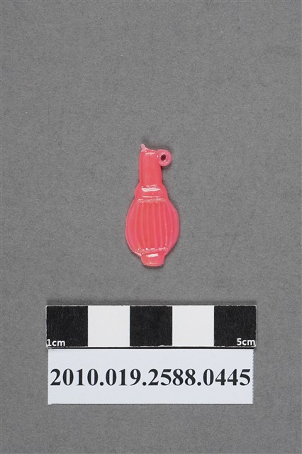 1.本物件為螺造型尪仔仙,為粉紅色塑膠材質。外型為螺,為俯視角度,前端為螺首,右側有射出痕,右側有圓環,中間為螺殼,有直紋凹凸痕,尾端為斧足。本系列尪仔仙多為相同塑膠模版,僅有顏色不同,或是同色同塑膠模版等形式。2.尪仔仙有小、中、大型之分,小型約長2公分,中型約長8-15公分左右,顏色以單色為主。長型則可長達30公分,以佛像、菩薩、神仙和唐三藏等造型為主,塗上金銀紅黃彩漆等亮色。1960、70年代的尪仔仙多以宗教、神話、布袋戲人物為造型。1980年代改以卡通、電玩、漫畫人物造型為主。常見玩法為兩人(或多人)各持一只尪仔仙,輪流用手指彈射,看誰的尪仔仙先疊在對方上面,便可贏得對方用來對戰的尪仔仙。