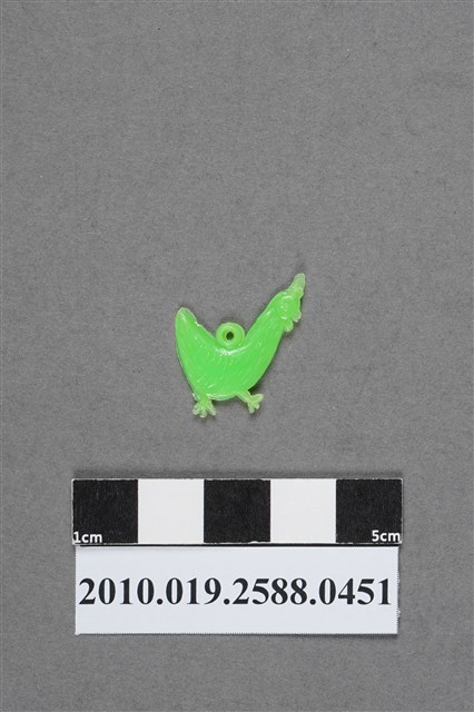 1.本物件為雞造型尪仔仙,為綠色塑膠材質。外型為雞,頭頂應有雞冠,無法判斷是缺損還是射出痕。雞喙下有肉垂,身上以線條呈現羽毛,背上有圓形環。本系列尪仔仙多為相同塑膠模版,僅有顏色不同,或是同色同塑膠模版等形式。2.尪仔仙有小、中、大型之分,小型約長2公分,中型約長8-15公分左右,顏色以單色為主。長型則可長達30公分,以佛像、菩薩、神仙和唐三藏等造型為主,塗上金銀紅黃彩漆等亮色。1960、70年代的尪仔仙多以宗教、神話、布袋戲人物為造型。1980年代改以卡通、電玩、漫畫人物造型為主。常見玩法為兩人(或多人)各持一只尪仔仙,輪流用手指彈射,看誰的尪仔仙先疊在對方上面,便可贏得對方用來對戰的尪仔仙。