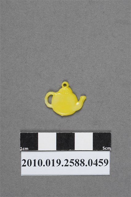1.本物件為茶壺造型尪仔仙,為黃色塑膠材質。外型為茶壺,形狀似橘形,壺蓋飾以放射紋,上方有圓形環。壺身平整光滑,左側為壺嘴,右側為把手,壺底有射出痕。物件背面色澤較正面淺,且有不均勻的情況。本系列尪仔仙多為相同塑膠模版,僅有顏色不同,或是同色同塑膠模版等形式。2.尪仔仙有小、中、大型之分,小型約長2公分,中型約長8-15公分左右,顏色以單色為主。長型則可長達30公分,以佛像、菩薩、神仙和唐三藏等造型為主,塗上金銀紅黃彩漆等亮色。1960、70年代的尪仔仙多以宗教、神話、布袋戲人物為造型。1980年代改以卡通、電玩、漫畫人物造型為主。常見玩法為兩人(或多人)各持一只尪仔仙,輪流用手指彈射,看誰的尪仔仙先疊在對方上面,便可贏得對方用來對戰的尪仔仙。