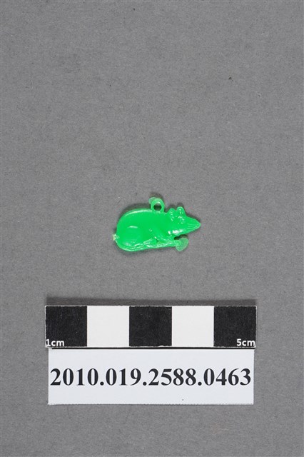 1.本物件為鼠造型尪仔仙,為綠色塑膠材質。外型為鼠,鼠首有眼睛及一對小耳,身體圓胖,細長的尾巴盤至四肢旁。背上有圓形環,環上有殘膠。臀部有射出痕,尾巴末端有一片殘膠。物件背面可明顯看出耳朵輪廓及吻部的鬍鬚。本系列尪仔仙多為相同塑膠模版,僅有顏色不同,或是同色同塑膠模版等形式。2.尪仔仙有小、中、大型之分,小型約長2公分,中型約長8-15公分左右,顏色以單色為主。長型則可長達30公分,以佛像、菩薩、神仙和唐三藏等造型為主,塗上金銀紅黃彩漆等亮色。1960、70年代的尪仔仙多以宗教、神話、布袋戲人物為造型。1980年代改以卡通、電玩、漫畫人物造型為主。常見玩法為兩人(或多人)各持一只尪仔仙,輪流用手指彈射,看誰的尪仔仙先疊在對方上面,便可贏得對方用來對戰的尪仔仙。