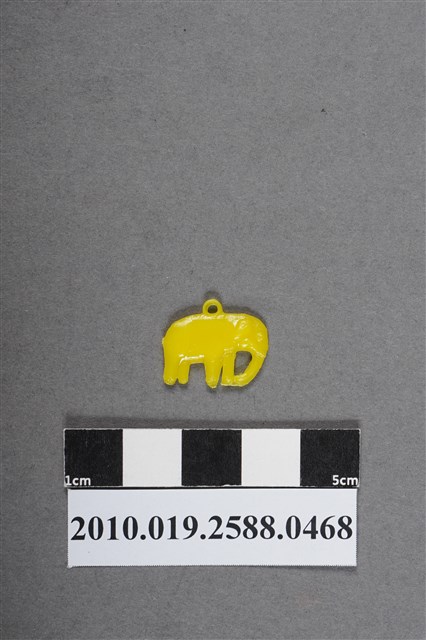 1.本物件為象造型尪仔仙,為黃色塑膠材質。外型為象,象身圓潤,身體下方為四足,象鼻下垂與一前足相連。象頭隱約可見眼、耳、象牙構造。背部有圓環,尾端有射出痕。物件反面明顯可見眼、耳、象牙等細部結構。本系列尪仔仙多為相同塑膠模版,僅有顏色不同,或是同色同塑膠模版等形式。2.尪仔仙有小、中、大型之分,小型約長2公分,中型約長8-15公分左右,顏色以單色為主。長型則可長達30公分,以佛像、菩薩、神仙和唐三藏等造型為主,塗上金銀紅黃彩漆等亮色。1960、70年代的尪仔仙多以宗教、神話、布袋戲人物為造型。1980年代改以卡通、電玩、漫畫人物造型為主。常見玩法為兩人(或多人)各持一只尪仔仙,輪流用手指彈射,看誰的尪仔仙先疊在對方上面,便可贏得對方用來對戰的尪仔仙。