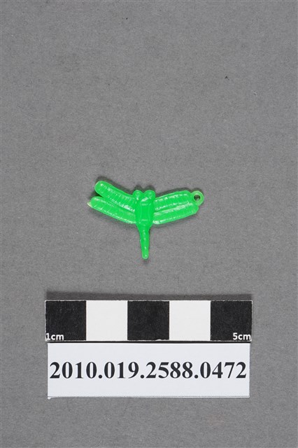 1.本物件為蜻蜓造型尪仔仙,為綠色塑膠材質。外型為蜻蜓,中間構造分為頭、胸、腹,頭部有一對複眼,胸部部位兩側共有兩對翅膀,上有直線擬做翅脈。右側下翅有射出痕,左側兩翅末端間有圓形環。物件反面結構大致與正面同,但眼睛部位各有一眼球,胸部部位有一方形框。本系列尪仔仙多為相同塑膠模版,僅有顏色不同,或是同色同塑膠模版等形式。2.尪仔仙有小、中、大型之分,小型約長2公分,中型約長8-15公分左右,顏色以單色為主。長型則可長達30公分,以佛像、菩薩、神仙和唐三藏等造型為主,塗上金銀紅黃彩漆等亮色。1960、70年代的尪仔仙多以宗教、神話、布袋戲人物為造型。1980年代改以卡通、電玩、漫畫人物造型為主。常見玩法為兩人(或多人)各持一只尪仔仙,輪流用手指彈射,看誰的尪仔仙先疊在對方上面,便可贏得對方用來對戰的尪仔仙。