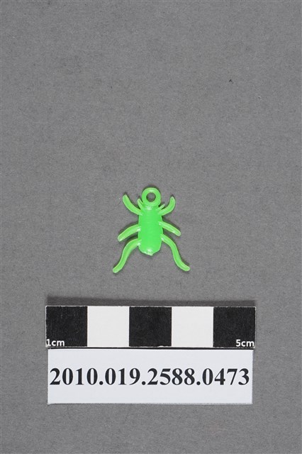 1.本物件為昆蟲造型尪仔仙,為綠色塑膠材質。外型為昆蟲,無法辯識為何種類。身體部位為長橢圓形,兩側各有三隻腳,頂端有一對觸鬚及一圓形環,尾端有射出痕。物件背面與正面同。本系列尪仔仙多為相同塑膠模版,僅有顏色不同,或是同色同塑膠模版等形式。2.尪仔仙有小、中、大型之分,小型約長2公分,中型約長8-15公分左右,顏色以單色為主。長型則可長達30公分,以佛像、菩薩、神仙和唐三藏等造型為主,塗上金銀紅黃彩漆等亮色。1960、70年代的尪仔仙多以宗教、神話、布袋戲人物為造型。1980年代改以卡通、電玩、漫畫人物造型為主。常見玩法為兩人(或多人)各持一只尪仔仙,輪流用手指彈射,看誰的尪仔仙先疊在對方上面,便可贏得對方用來對戰的尪仔仙。