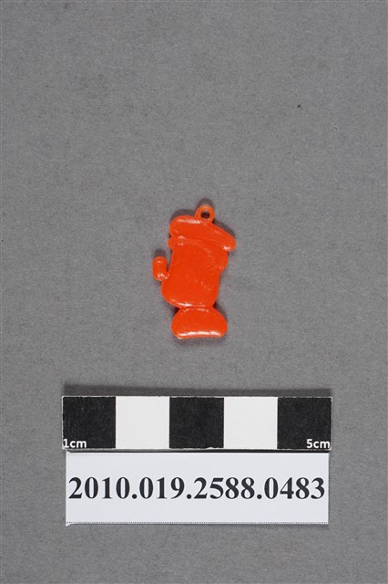 1.本物件為大力水手尪仔仙,為橘色塑膠材質。外型為大力水手,頭上戴海軍帽,帽頂有圓形環。五官表情嚴肅,嘴裡叼著煙斗。頭部下方部分應為V領海軍服,右下方有射出痕。物件背面無細部結構,有些微磨損痕跡。本系列尪仔仙多為相同塑膠模版,僅有顏色不同,或是同色同塑膠模版等形式。