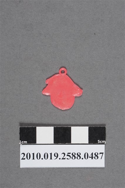 1.本物件為男性頭像造型尪仔仙,為粉紅色塑膠材質。外型為男性頭像,頭髮雜亂參差不齊,臉形渾圓,表情敦厚,頭頂有圓形環。物件背面無細部結構,有磨損痕跡。本系列尪仔仙多為相同塑膠模版,僅有顏色不同,或是同色同塑膠模版等形式。