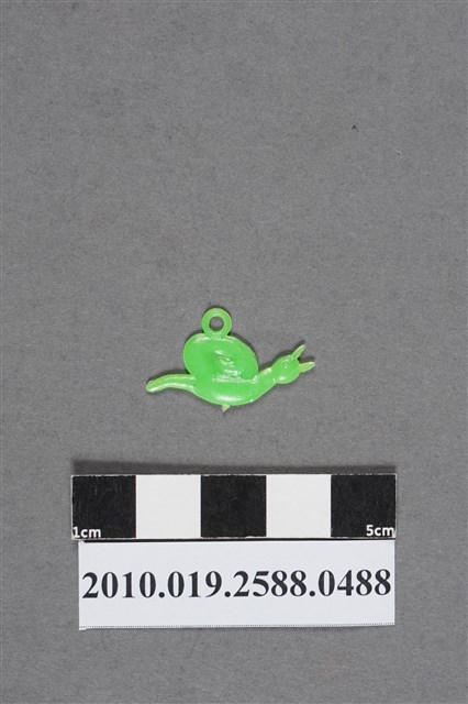 1.本物件為蝸牛造型尪仔仙,為綠色塑膠材質。外型為蝸牛,分為殼與身體部位,殼有螺旋紋,上方有圓形環。身體部分,左側為頭部,可見兩個眼睛,上有兩根觸鬚,腹足下方有射出痕。物件反面與正面同。本系列尪仔仙多為相同塑膠模版,僅有顏色不同,或是同色同塑膠模版等形式。