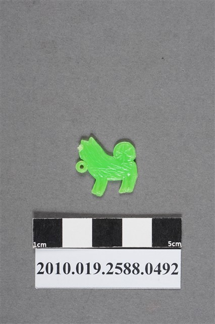1.本物件為狗造型尪仔仙,為綠色塑膠材質。外型為狗,頭上有一對豎起的尖耳,右側有射出痕,五官簡單,脖子處有一圓形環。四肢直立,身上有交錯的線形紋,臀部上方有一內有放射狀線紋的球形,應是捲曲成球狀的尾巴。物件背面覆滿交錯的線形紋,表示毛絨絨的狀態。本系列尪仔仙多為相同塑膠模版,僅有顏色不同,或是同色同塑膠模版等形式。